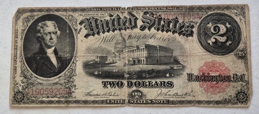 1917 $2 Two DOLLAR UNITED STATES LEGAL TENDER NOTE SEAL RED LARGE PAPER MONEY -7682A