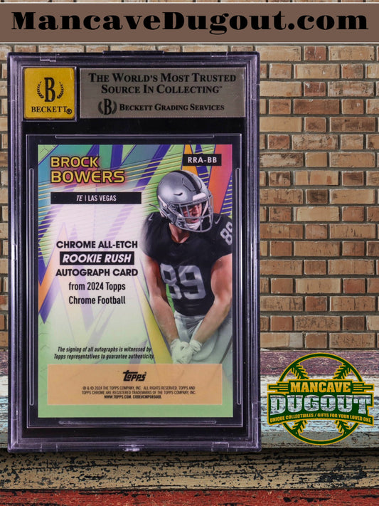 Brock Bowers 2024 Topps Chrome All Etch Rookie Rush Autographs Aqua Refractors RRABB No. 044 of 199 RC (BGS 9.5 Auto 10)