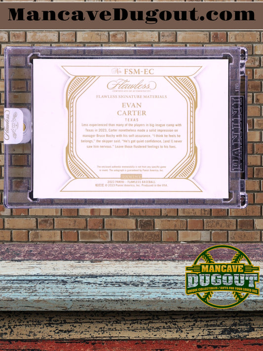 Evan Carter 2023 Panini Flawless - Signature Materials – Ruby Parallel #52-(RC)–#01/20 (First Off the Line)