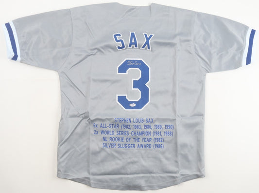 Steve Sax Signed Career Highlight Stat Jersey (PSA) - LA Dodgers