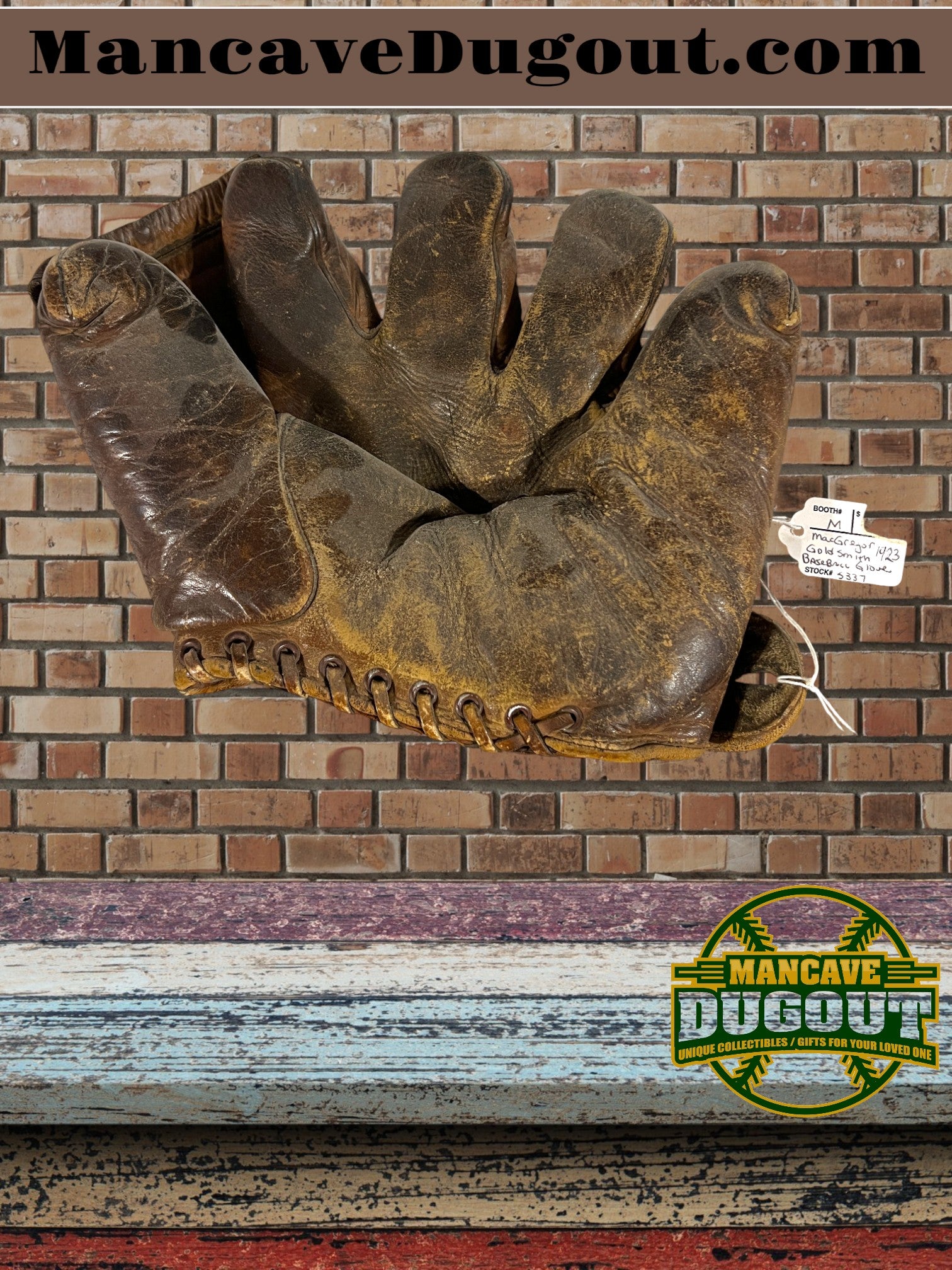 Vintage MacGregor Goldsmith leather baseball glove. 1920’s (Tag says 1923). Has name on the back strap “J. Kane”. Good vintage condition. Lacing look original – 5-Finger Design. Please see all pictures for details.