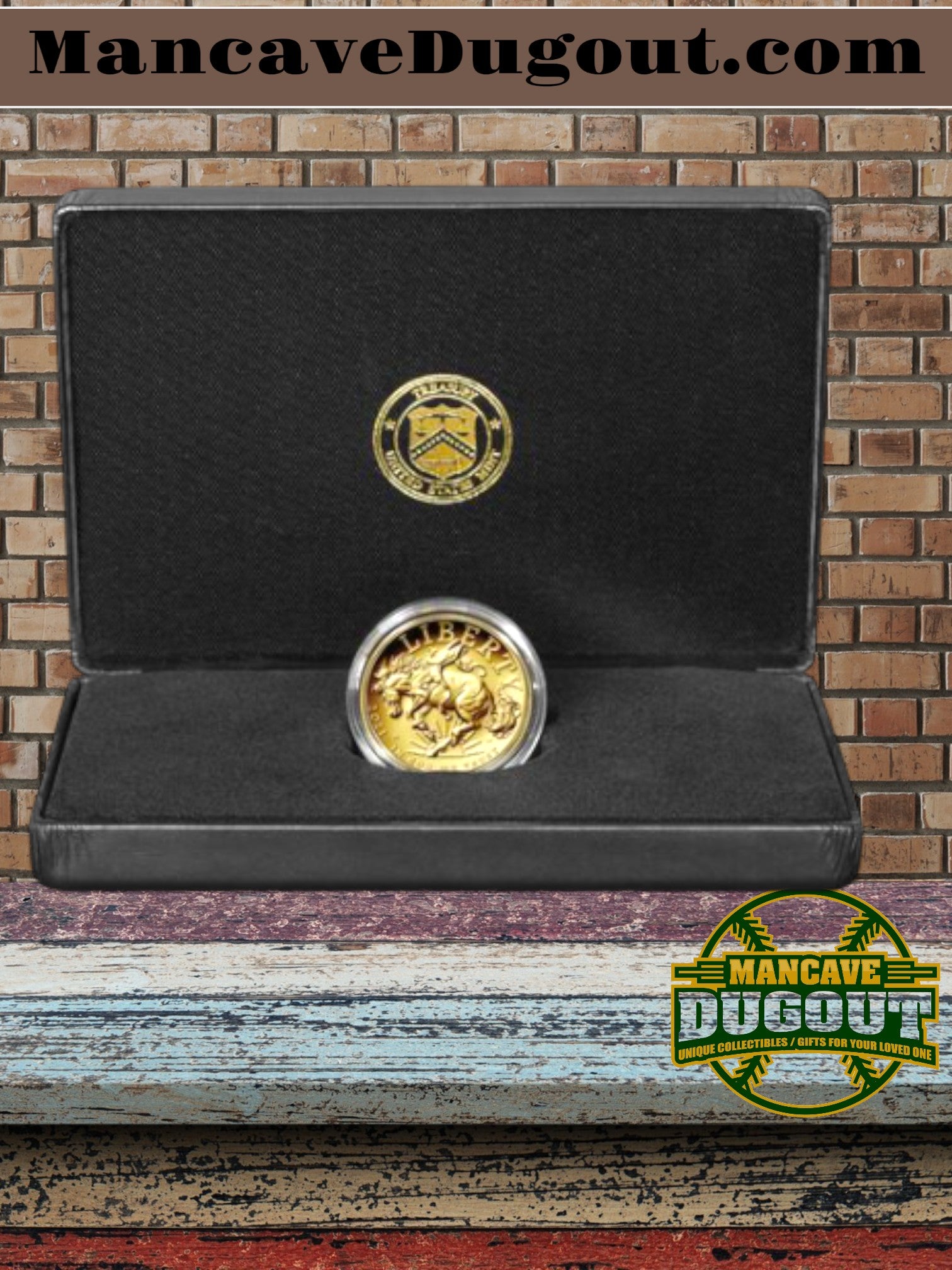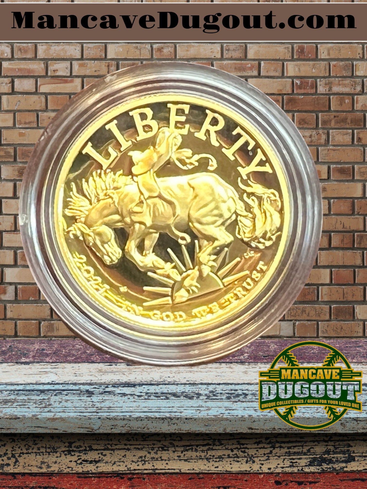 The 2021 American Liberty High Relief Gold Coin™ is struck in 24-karat gold. The obverse (heads) features a wild American Mustang horse, bucking off a western-style saddle, evoking the throwing off of the yoke of British rule during the American Revolution. The horse is centered on a rising sun. Inscriptions are “LIBERTY,” “IN GOD WE TRUST,” and “2021.”
