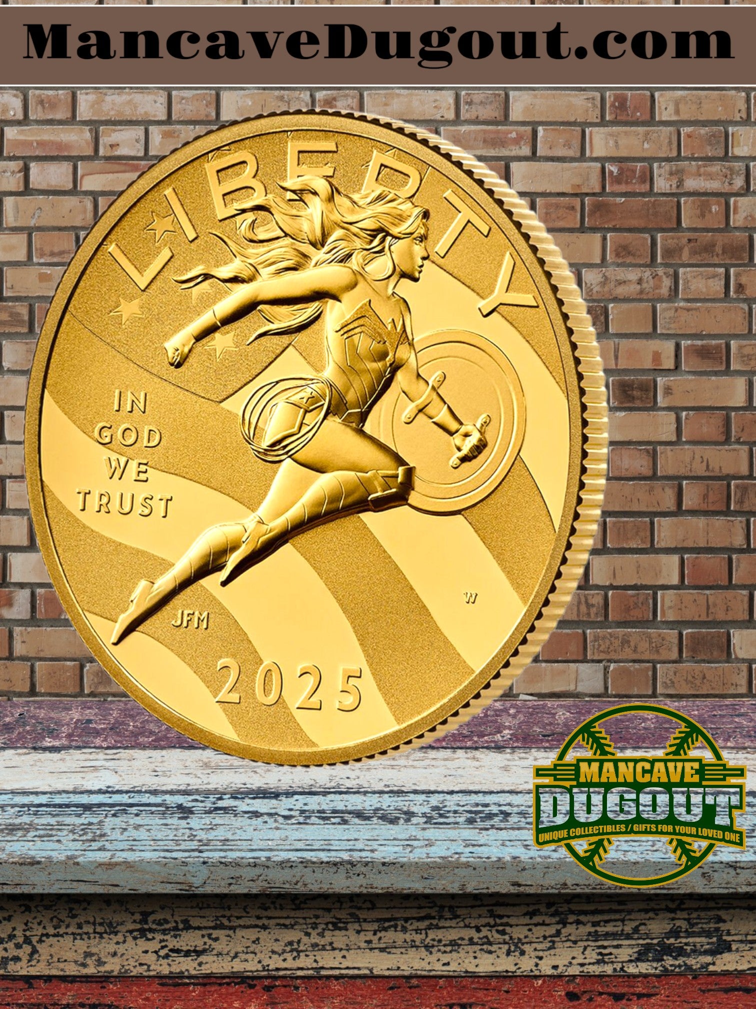 Depicts Wonder Woman™ leaping into action with her iconic shield and lasso of truth. The stripes of the American flag featured in the background are a nod to her signature costume designed during World War II. Inscriptions are “LIBERTY,” “IN GOD WE TRUST,” and “2025.”