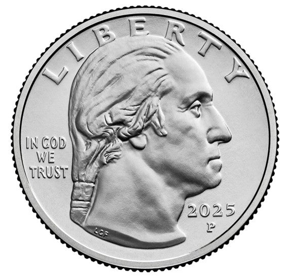 The obverse (heads) side displays a portrait of George Washington, originally designed and sculpted by Laura Gardin Fraser for the 1932 quarter commemorating the bicentennial of Washington’s birth. Inscriptions are “LIBERTY,” “IN GOD WE TRUST,” and “2025.”