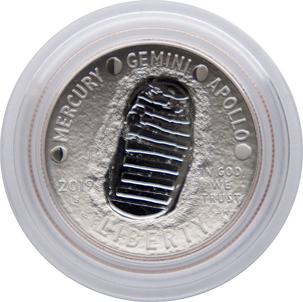 Obverse: This design features the inscriptions “MERCURY,” “GEMINI,” and “APOLLO,” separated by phases of the Moon, and a footprint on the lunar surface, which together represent the efforts of the United States space program leading up to the first manned Moon landing. Additional inscriptions include “2019,” “IN GOD WE TRUST,” and “LIBERTY.”