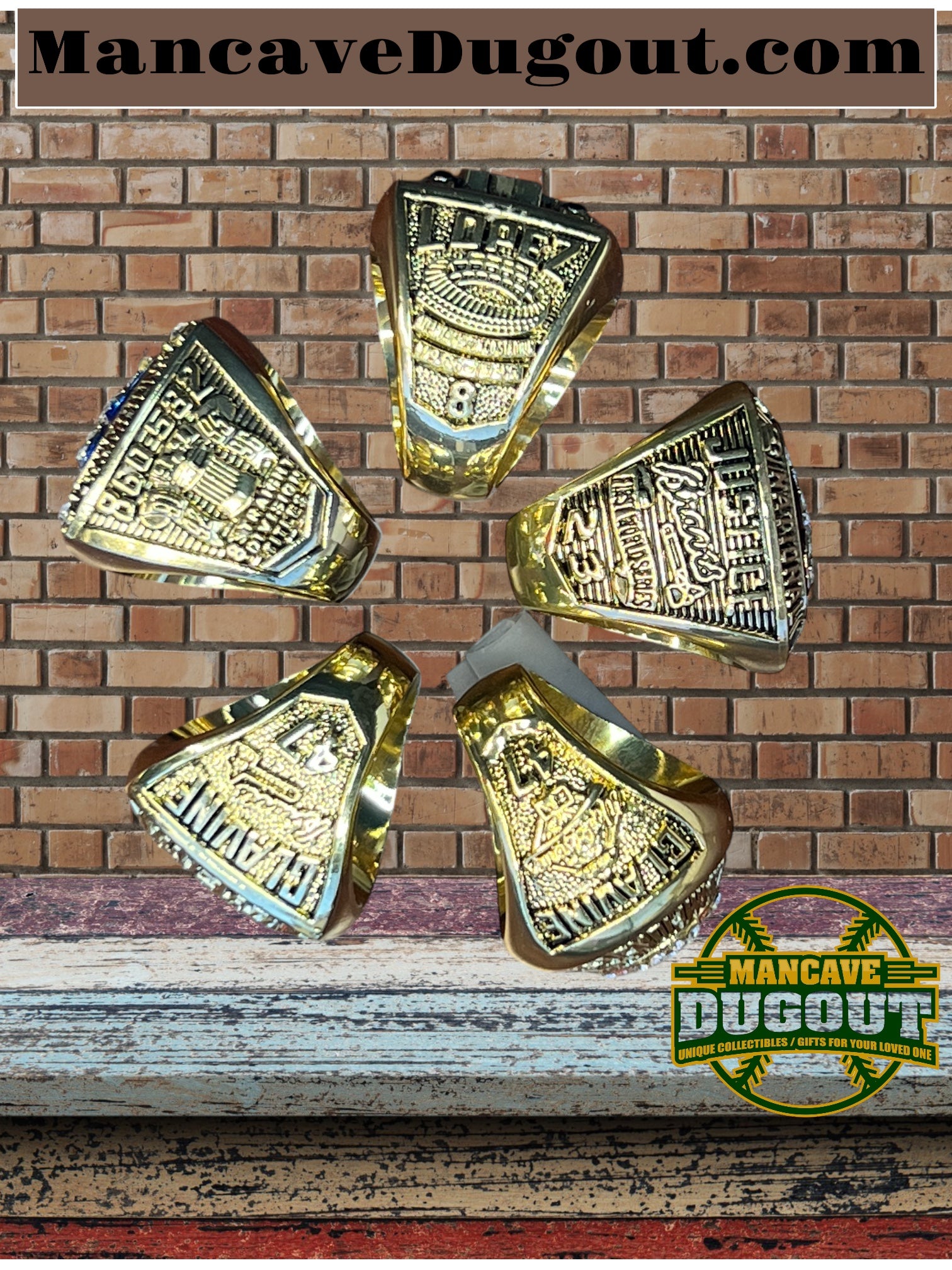 This set includes five Atlanta Braves championship souvenir rings from the years 1991 1992 1995 1996 1999, accompanied by an elegant display case. Ideal for placement on a shelf, desk, office, or mancave, these rings make an exceptional gift for any dedicated Atlanta Brave. (Includes players like Justice, Glavin, and more)