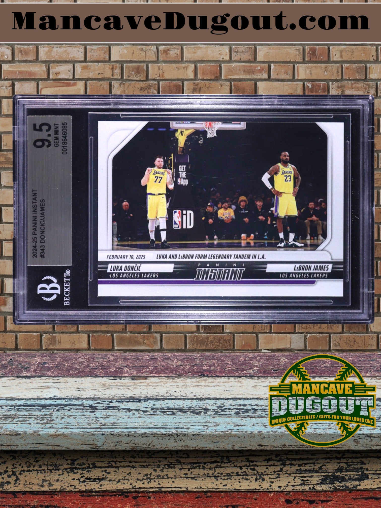 Showcase two of the biggest names in basketball with this LeBron James / Luka Dončić 2024‑25 Panini Instant #343, graded an impressive BGS 9.5 Gem Mint. Panini Instant captures key moments and matchups in real time, and this dual‑superstar card delivers premium appeal with a top‑tier grade to match.