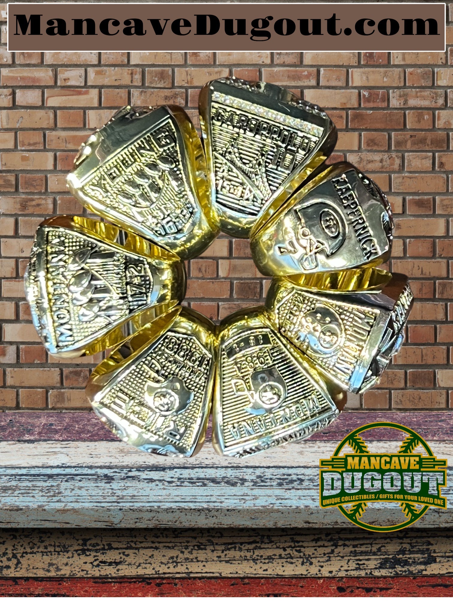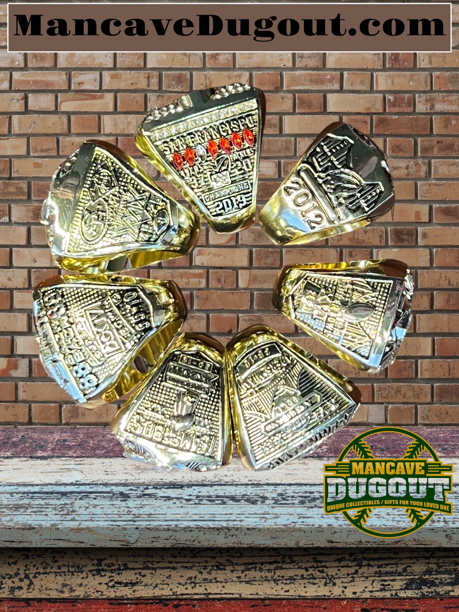 This set includes seven San Francisco championship souvenir rings from the years 1981, 1984, 1988, 1989, 1994, 2012, and 2019, accompanied by an elegant display case. Ideal for placement on a shelf, desk, office, or mancave, these rings make an exceptional gift for any dedicated 49ers enthusiast. (Includes players like Montana, Young, Rice and more). All Size 11.