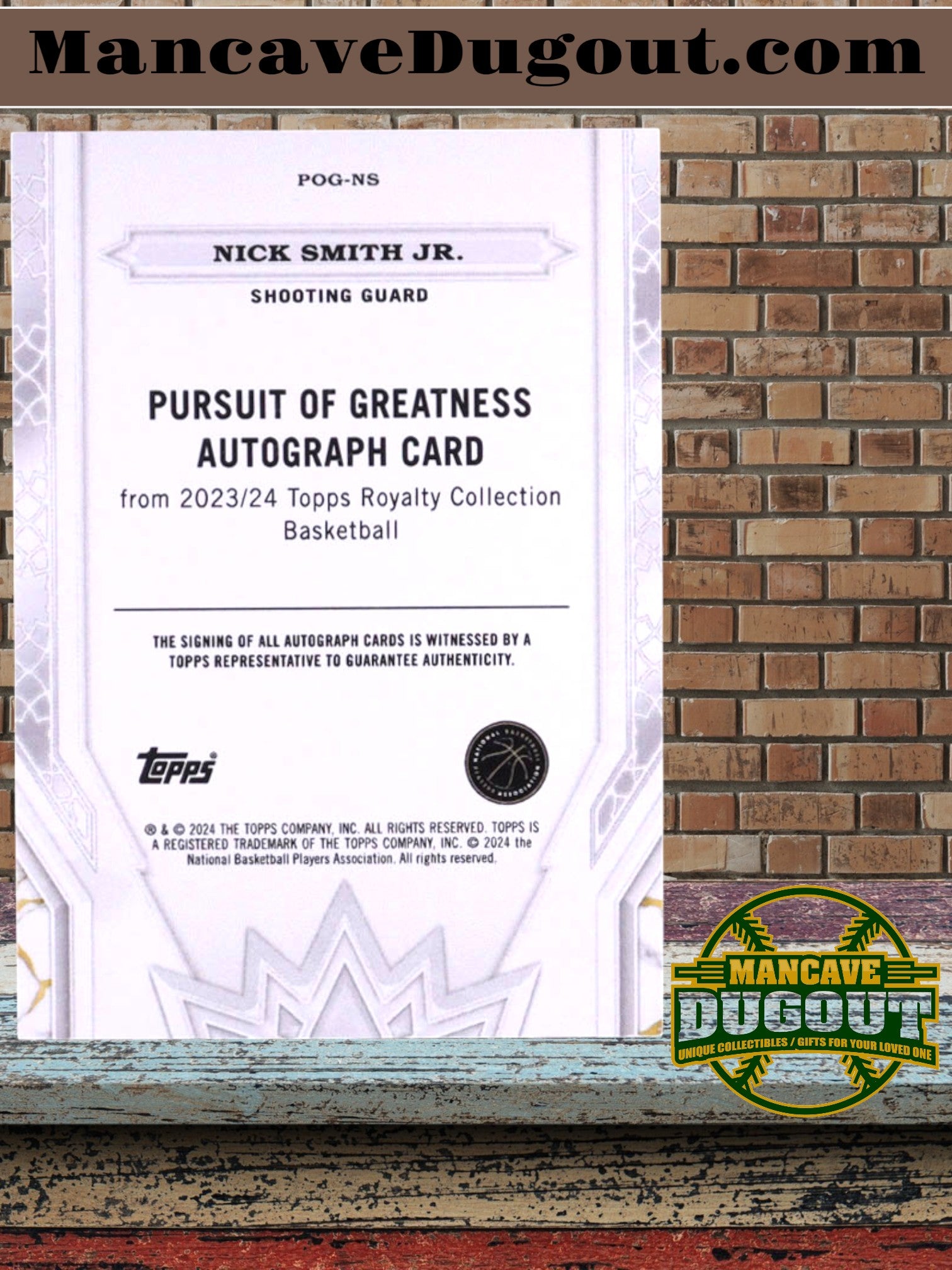 Showcase an ultra‑rare rookie autograph from one of the most exciting young guards in the league with this Nick Smith Jr. 2023‑24 Topps Royalty Pursuit of Greatness Signatures Platinum (#POGNS). Stamped 1/1, this is the only Platinum rookie auto of its kind—making it a true centerpiece for any modern basketball collection.