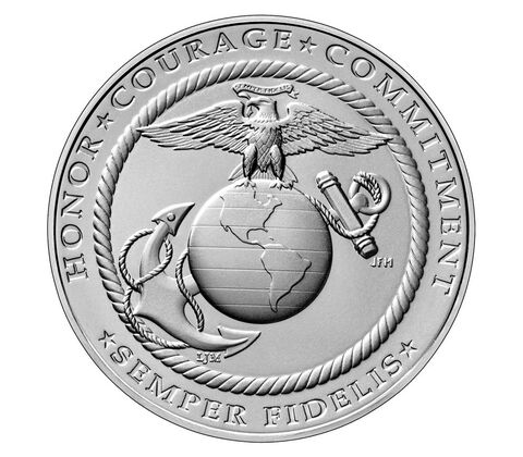 The reverse depicts the familiar Marine Corps Eagle, Globe, and Anchor emblem encircled by a rope border. Its core values, “HONOR,” “COURAGE,” and “COMMITMENT,” and the Marine Corps motto “SEMPER FIDELIS,” (“Always Faithful”), are inscribed around the outer border.